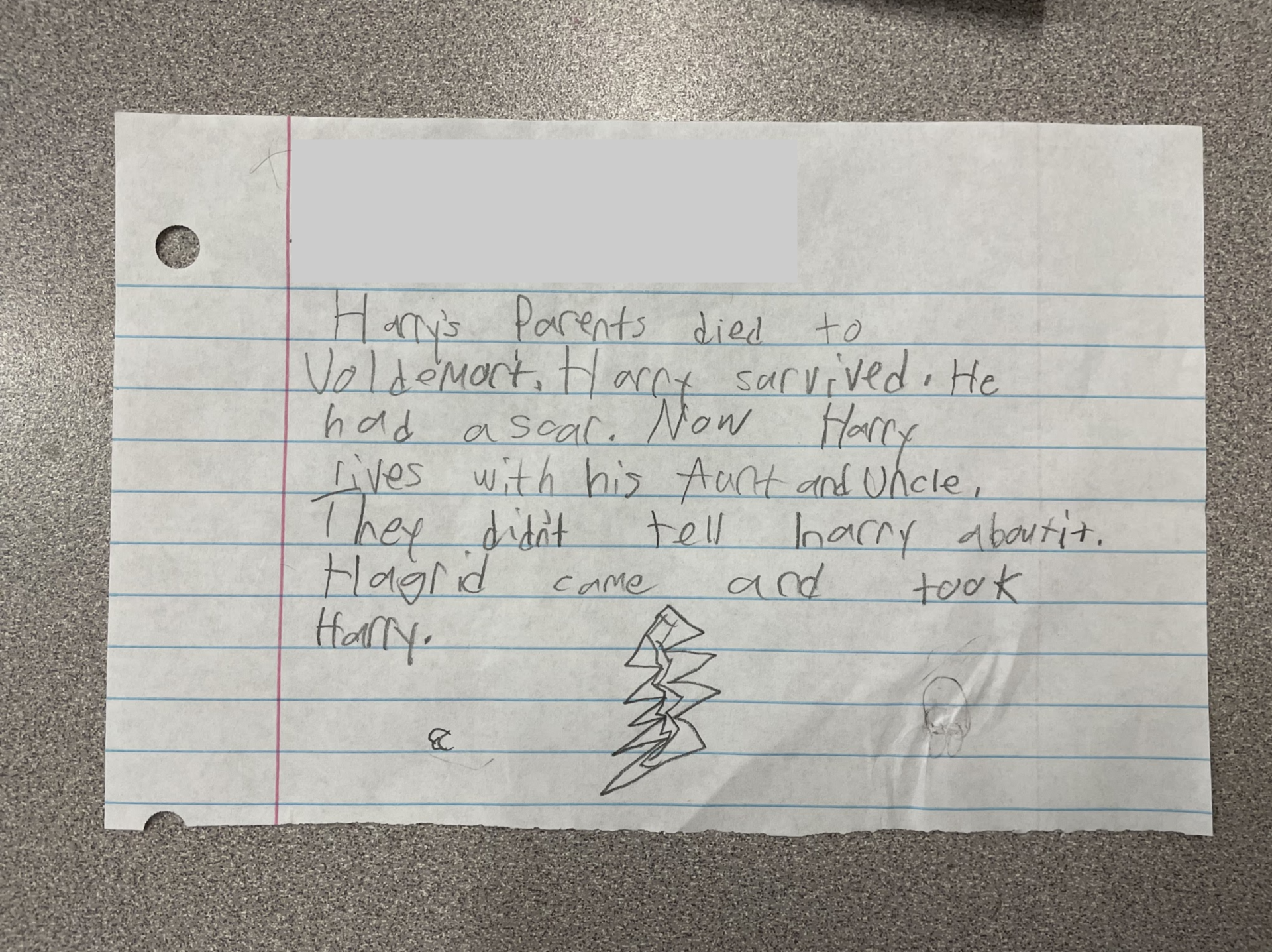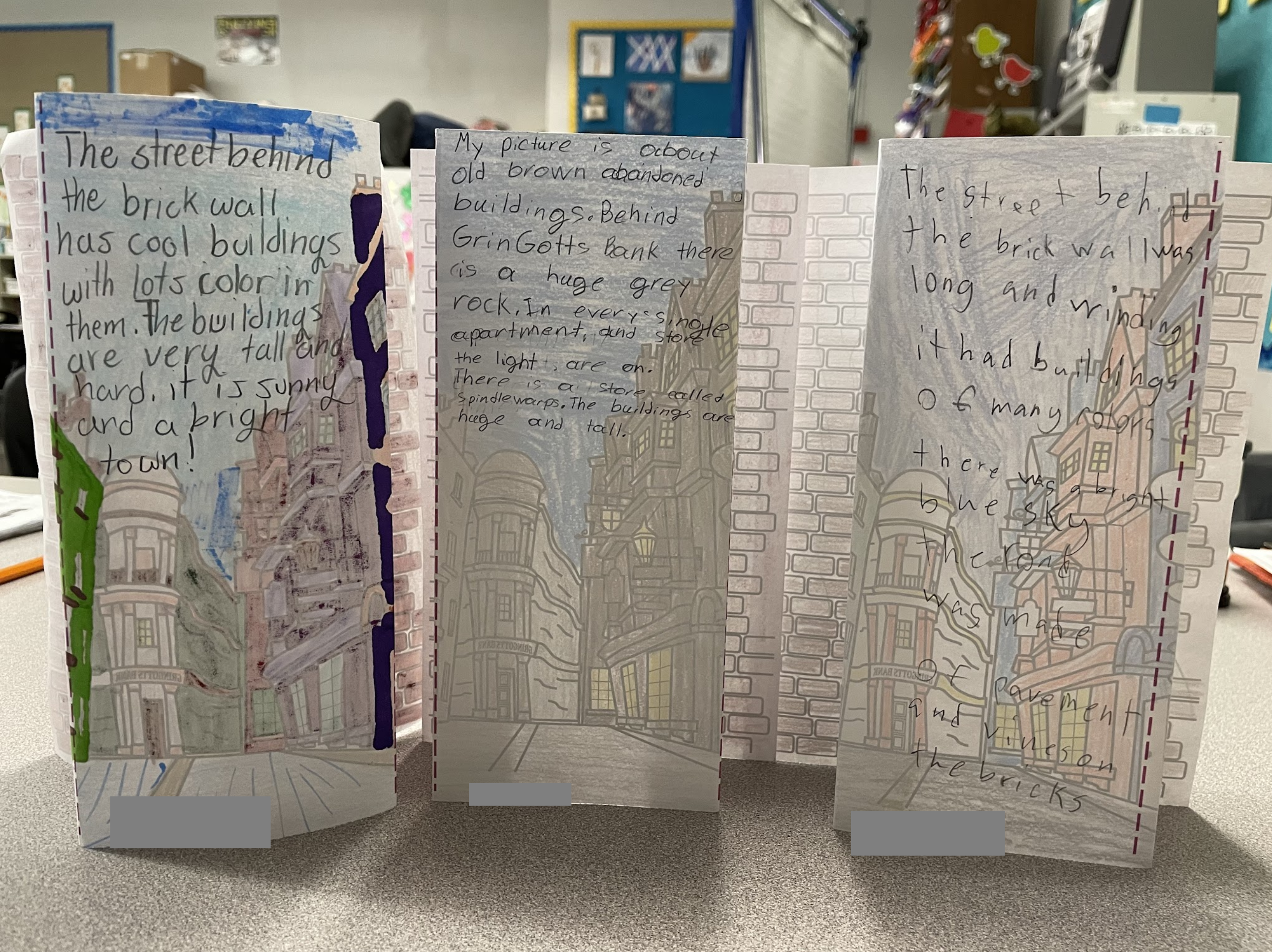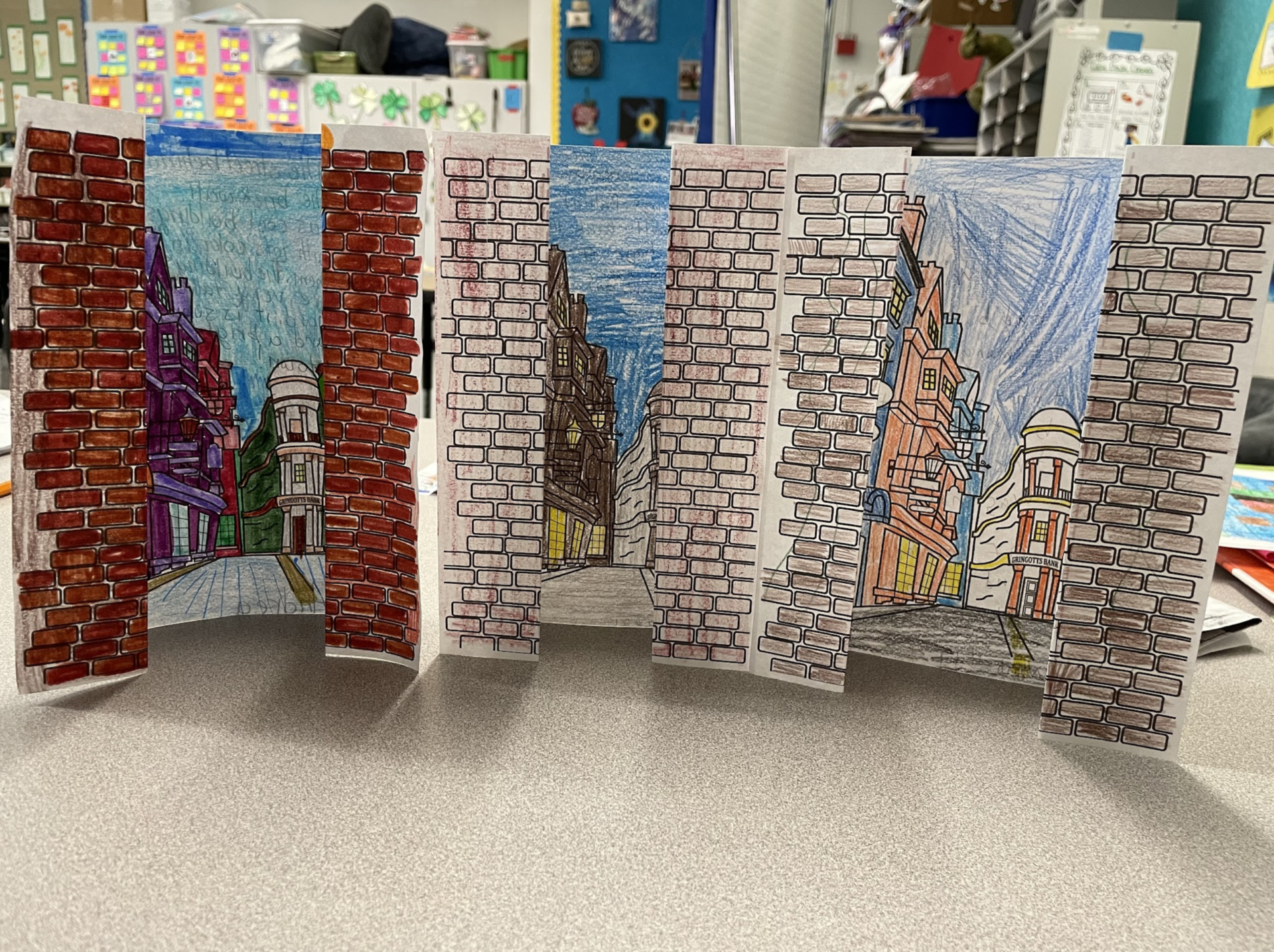 In this activity, we reread the section of the book describing Diagon Alley. We identified several descriptive details about the setting. Two students helped pass out the Diagon Alley coloring sheet and students created their own version of Diagon Alley.