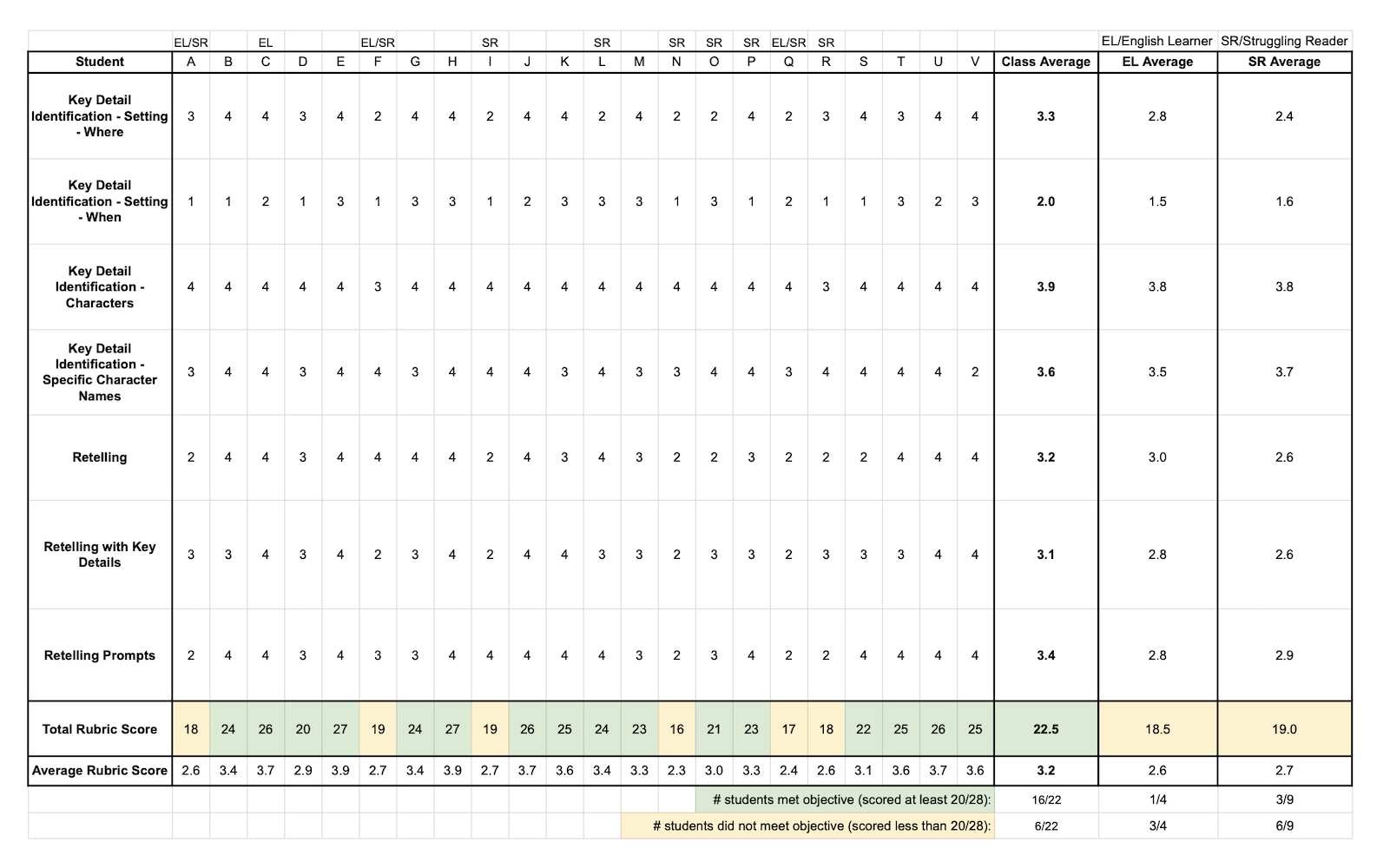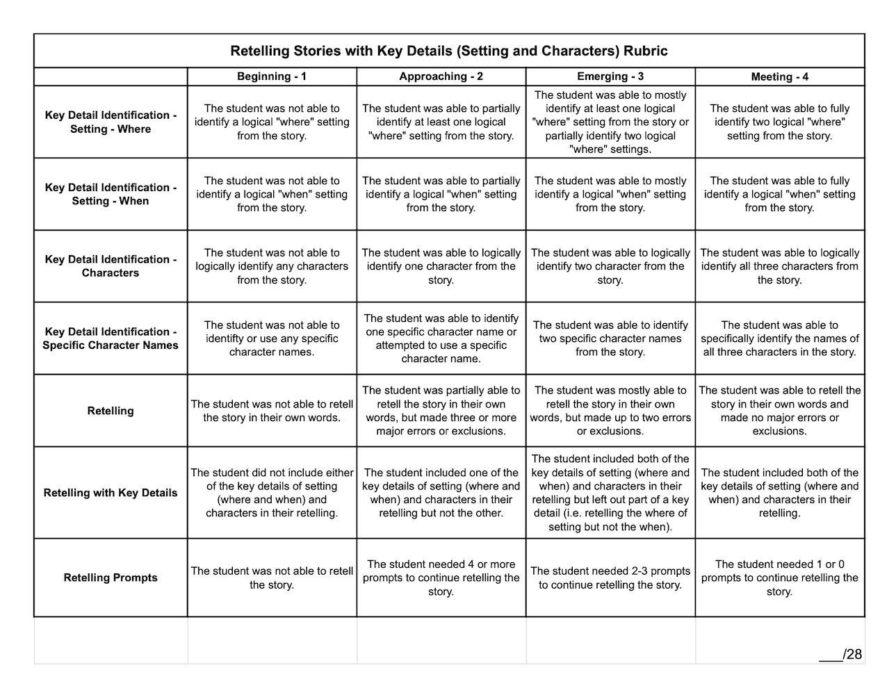○ Assessed student progress individually using a rubric as they listened to a story and then orally identified key