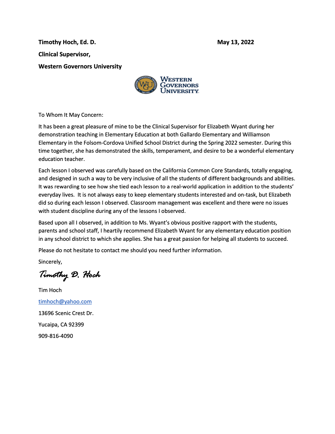 I’d love the opportunity to discuss joining your team! You can call me at 916.673.7571 or email me at ElizabethDWyant@gmail.com. Thank you for your consideration!